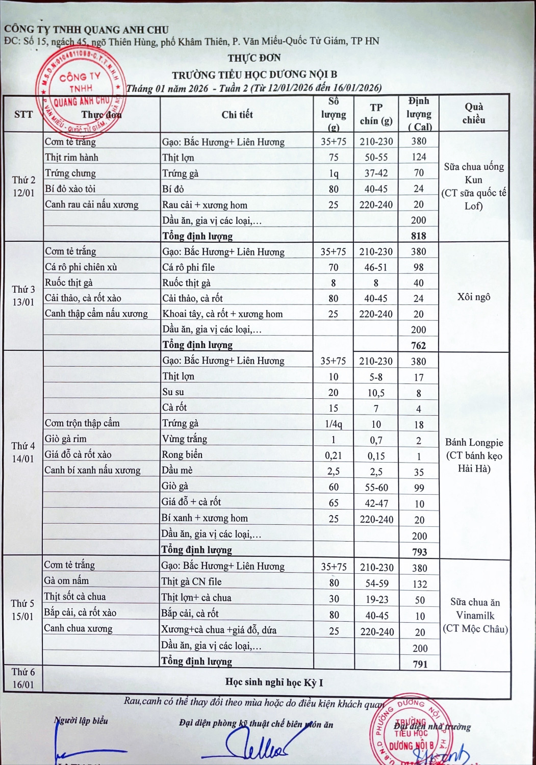 Thực đơn bán trú tháng 1 tuần 2 năm học 2025-2026
