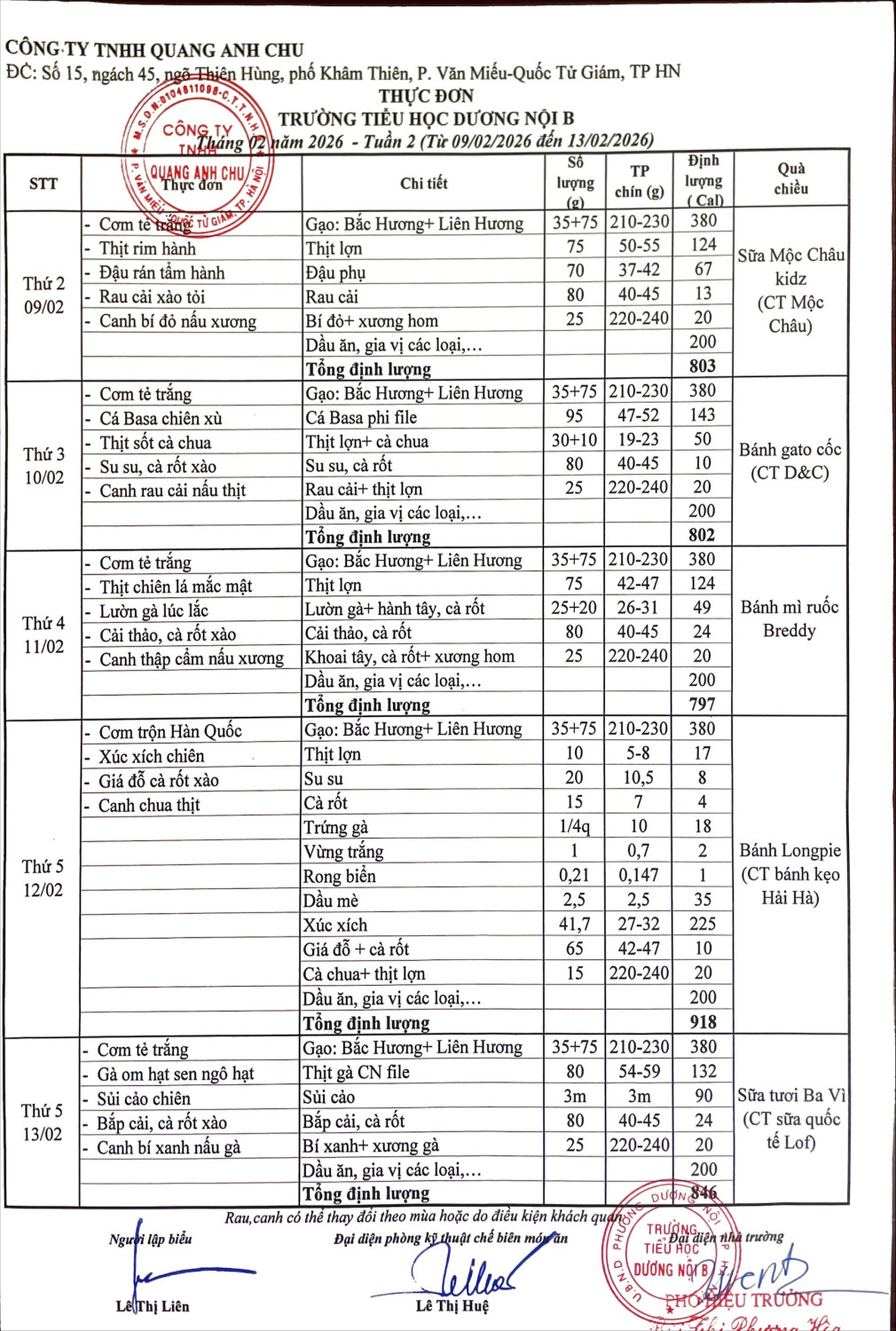 Thực đơn bán trú tháng 2 tuần 2 năm học 2025-2026