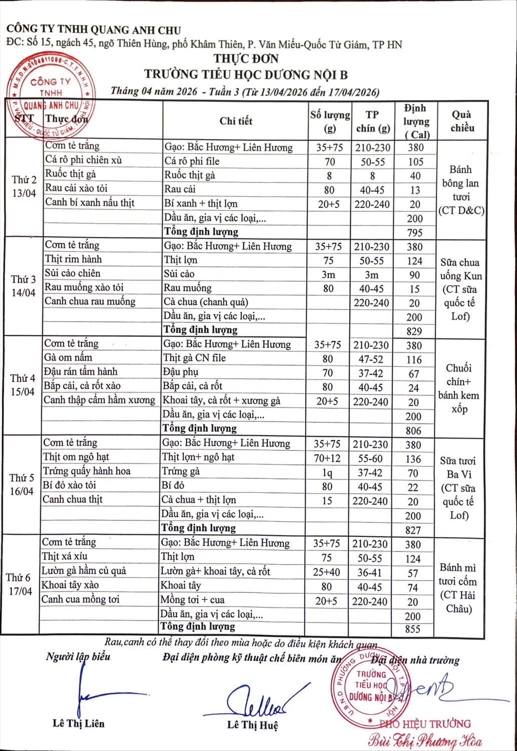 Thực đơn bán trú tháng 4 tuần 3 năm học 2025-2026