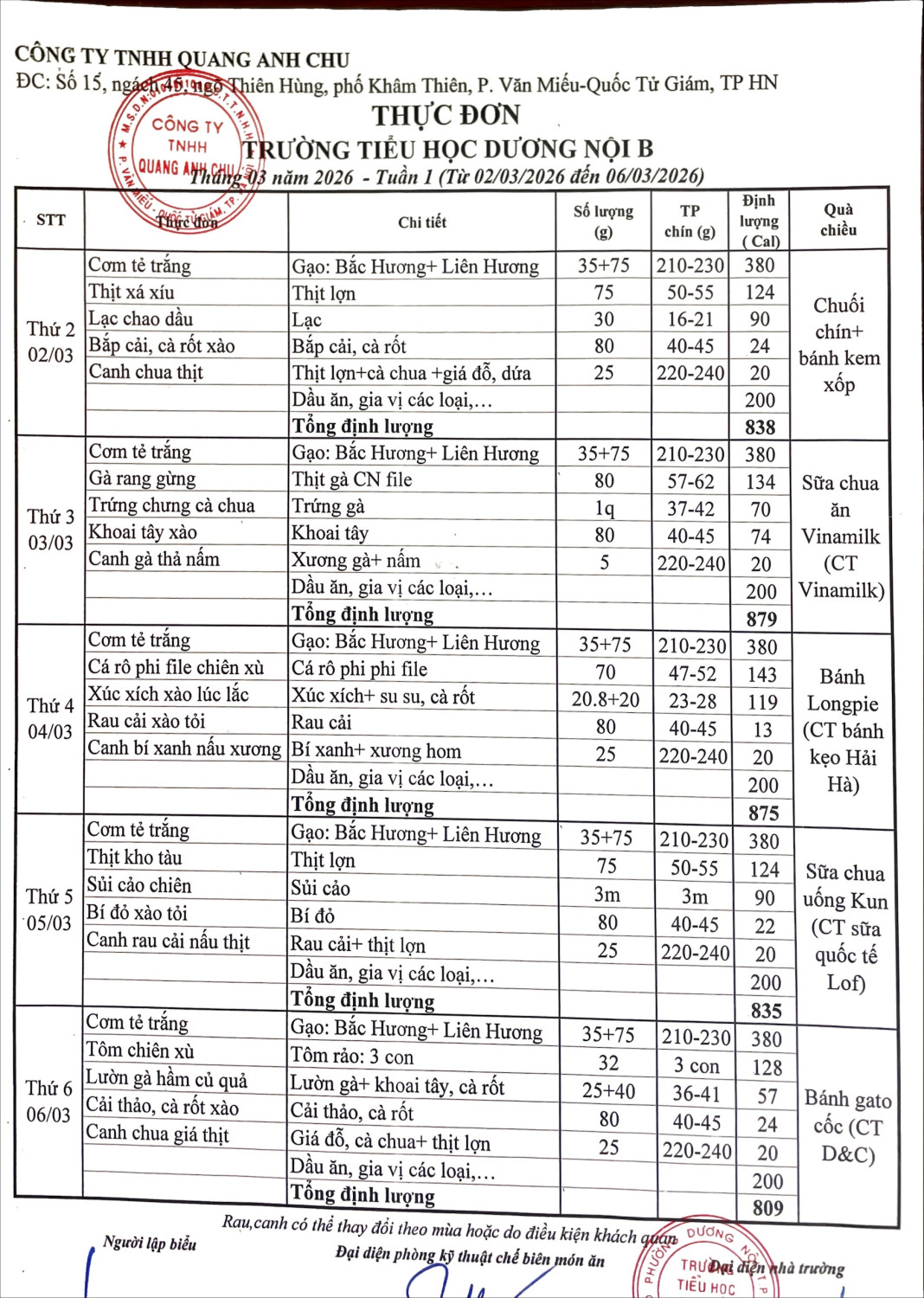Thực đơn bán trú tháng 3 tuần 1 năm học 2025-2026