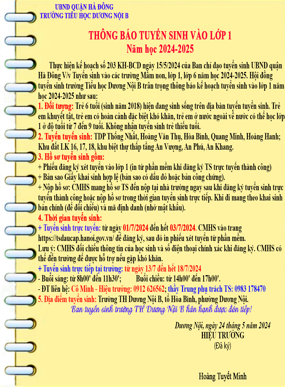1. Đối tượng: Trẻ 6 tuổi (sinh năm 2018) hiện đang sinh sống trên địa bàn tuyến tuyển sinh. Trẻ em khuyết tật, trẻ em có hoàn cảnh đặc biệt khó khăn, trẻ em ở nước ngoài về nước có thể học lớp 1 ở độ tuổi từ 7 đến 9 tuổi. Không nhận tuyển sinh trẻ thiếu tuổi. 2. Tuyến tuyến sinh: TDP Thống Nhất, Hoàng Văn Thụ, Hòa Bình, Quang Minh, Hoàng Hanh; Khu đất LK 16, 17, 18, khu biệt thự thấp tầng An Vượng, An Phú, An Khang. 3. Hồ sơ tuyển sinh gồm: + Phiếu đăng ký xét tuyển vào lớp 1 (in từ phần mềm khi đăng ký TS trực tuyến thành công) + Bản sao Giấy khai sinh hợp lệ (bản sao có dấu đỏ hoặc bản công chứng). + Nộp hồ sơ: CMHS mang hồ sơ TS đến nộp tại nhà trường ngay sau khi đăng ký tuyển sinh trực tuyến thành công hoặc nộp hồ sơ trong thời gian tuyển sinh trực tiếp. Khi đi mang theo khai sinh bản chính (để đối chiếu) và mã định danh (nhớ mật khẩu). 4. Thời gian tuyển sinh: + Tuyển sinh trực tuyến: từ ngày 01/7/2024 đến hết 03/7/2024. CMHS vào trang https://tsdaucap.hanoi.gov.vn/để đăng ký, sau đó in phiếu xét tuyển từ phần mềm. Lưu ý: CMHS đối chiếu thông tin của học sinh và số điện thoại chính xác khi đăng ký. CMHS có thể đến trường để được hỗ trợ nếu gặp khó khăn. + Tuyển sinh trực tiếp tại trường: từ ngày 13/7 đến hết 18/7/2024 - Buổi sáng: từ 8h00' đến 11h30'; Buổi chiều: từ 14h00' đến 17h00'. - ĐT liên hệ: Cô Minh - Hiệu trưởng: 0912 626562; thầy Trung phụ trách TS: 0983 178470 5. Địa điểm tuyển sinh: Trường TH Dương Nội B, tổ Hòa Bình, phường Dương Nội. Ban tuyển sinh trường TH Dương Nội B hân hạnh được đón tiếp!