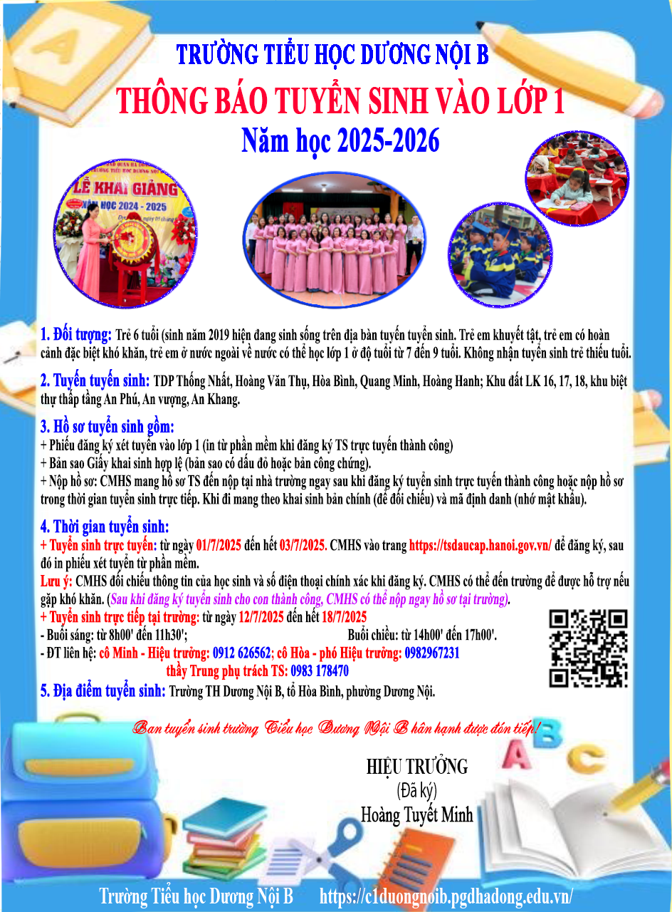 Trường Tiểu học Dương Nội B thông báo tuyển sinh năm học 2025-20261. Đối tượng: Trẻ 6 tuổi (sinh năm 2019 hiện đang sinh sống trên địa bàn tuyến tuyển sinh. Trẻ em khuyết tật, trẻ em có hoàn cảnh đặc biệt khó khăn, trẻ em ở nước ngoài về nước có thể học lớp 1 ở độ tuổi từ 7 đến 9 tuổi. Không nhận tuyển sinh trẻ thiếu tuổi. 2. Tuyến tuyến sinh: TDP Thống Nhất, Hoàng Văn Thụ, Hòa Bình, Quang Minh, Hoàng Hanh; Khu đất LK 16, 17, 18, khu biệt thự thấp tầng An Phú, An vượng, An Khang.3. Hồ sơ tuyển sinh gồm:+ Phiếu đăng ký xét tuyển vào lớp 1 (in từ phần mềm khi đăng ký TS trực tuyến thành công)+ Bản sao Giấy khai sinh hợp lệ (bản sao có dấu đỏ hoặc bản công chứng).+ Nộp hồ sơ: CMHS mang hồ sơ TS đến nộp tại nhà trường ngay sau khi đăng ký tuyển sinh trực tuyến thành công hoặc nộp hồ sơ trong thời gian tuyển sinh trực tiếp. Khi đi mang theo khai sinh bản chính (để đối chiếu) và mã định danh (nhớ mật khẩu).4. Thời gian tuyển sinh: + Tuyển sinh trực tuyến: từ ngày 01/7/2025 đến hết 03/7/2025. CMHS vào trang https://tsdaucap.hanoi.gov.vn/ để đăng ký, sau đó in phiếu xét tuyển từ phần mềm. Lưu ý: CMHS đối chiếu thông tin của học sinh và số điện thoại chính xác khi đăng ký. CMHS có thể đến trường để được hỗ trợ nếu gặp khó khăn. (Sau khi đăng ký tuyển sinh cho con thành công, CMHS có thể nộp ngay hồ sơ tại trường).+ Tuyển sinh trực tiếp tại trường: từ ngày 12/7/2025 đến hết 18/7/2025 - Buổi sáng: từ 8h00' đến 11h30'; Buổi chiều: từ 14h00' đến 17h00'. - ĐT liên hệ: cô Minh - Hiệu trưởng: 0912 626562; cô Hòa - phó Hiệu trưởng: 0982967231, thầy Trung phụ trách TS: 0983 178470; 5. Địa điểm tuyển sinh: Trường TH Dương Nội B, tổ Hòa Bình, phường Dương Nội.